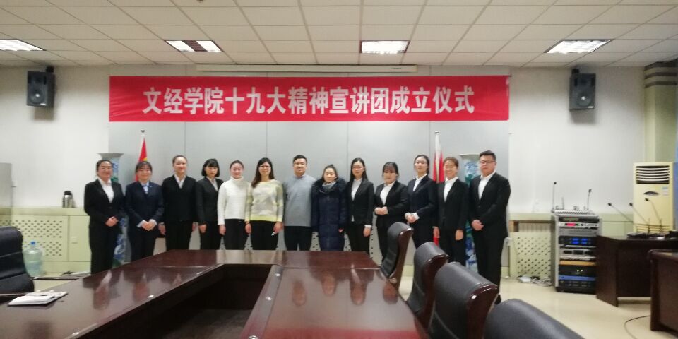 为深入学习宣传贯彻党的十九大精神,12月20日下午,我院于师专校区第一教学楼一楼会议室举行十九大精神宣讲团成立仪式。仪式由我院学工办主任仝世涛主持,辅导员李欣茹、李迎娣,宣讲团组成人员参加本次仪式。