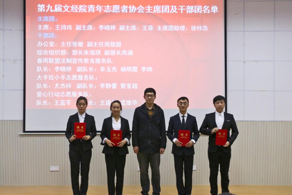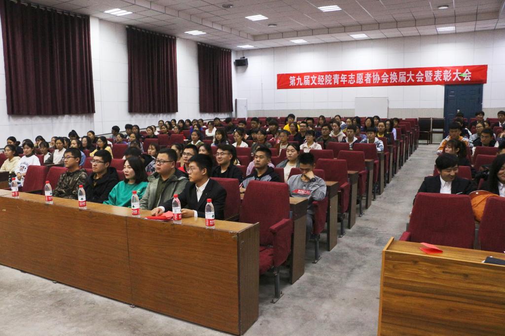 第八届文经院青协主席孙鹏作工作总结,并对新一届协会主席团、部长团及各位学生干事提出了新的要求,并将文经青年志愿者旗帜移交给第九届文经院青协主席王诗玮。