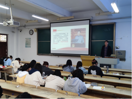 10月11日晚,我院辅导员黄睿哲在新教104为2018级法学、2018级秘书学专业学生讲授形势与政策课。