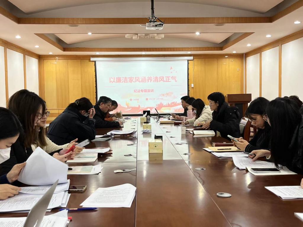 我院教师张朋程进行“以廉洁家风涵养清风正气”纪法专题宣讲。宣讲从三部分展开:一是深刻认识家风与作风的关系,以良好家风助推党风政风社风民风清正清朗、向上向善。二是从家风败坏典型案例中汲取教训,戒尺高悬、警钟长鸣、引以为戒。三是从一体推进“三不腐”的方针方略,深刻认识家风建设特殊功能,筑牢拒腐防变家庭防线。