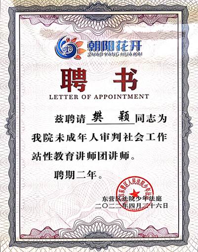 4月26日下午,东营区人民法院隆重举行未成年人审判社会工作站讲师团讲师聘任仪式。东营市中级人民法院党组成员、副院长李金强、东营区区委常委、政法委书记盖滨、区关工委主任宋家敬出席仪式,仪式由东营区人民法院党组书记、院长丁文强主持。我院法学系教师樊颖被聘为性教育讲师团讲师,聘期二年。