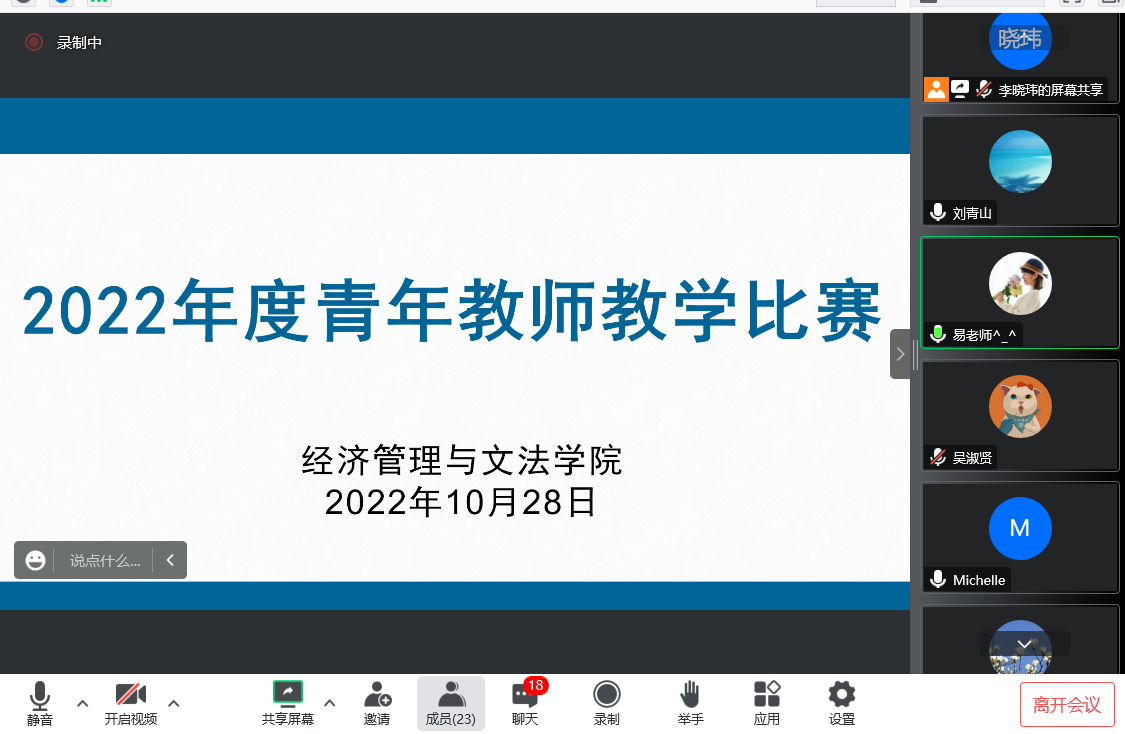 为深入推进课堂教学改革,促进青年教师的发展,打造各具特色的创新性课堂教学模式,10月28日下午,我院通过腾讯会议平台举办了2022年度青年教师教学比赛,并邀请学院青年教师观摩学习。