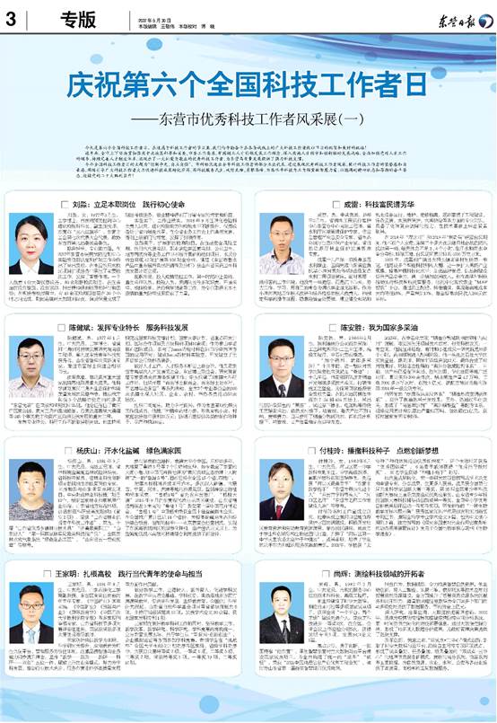 5月30日,是第六个全国科技工作者日。市科协优选出全市科技工作者的部分杰出代表,刊登在东营日报“东营市优秀科技工作者风采展”专版。我院王家明副教授成功入选。