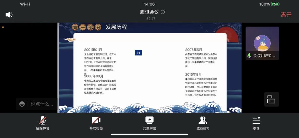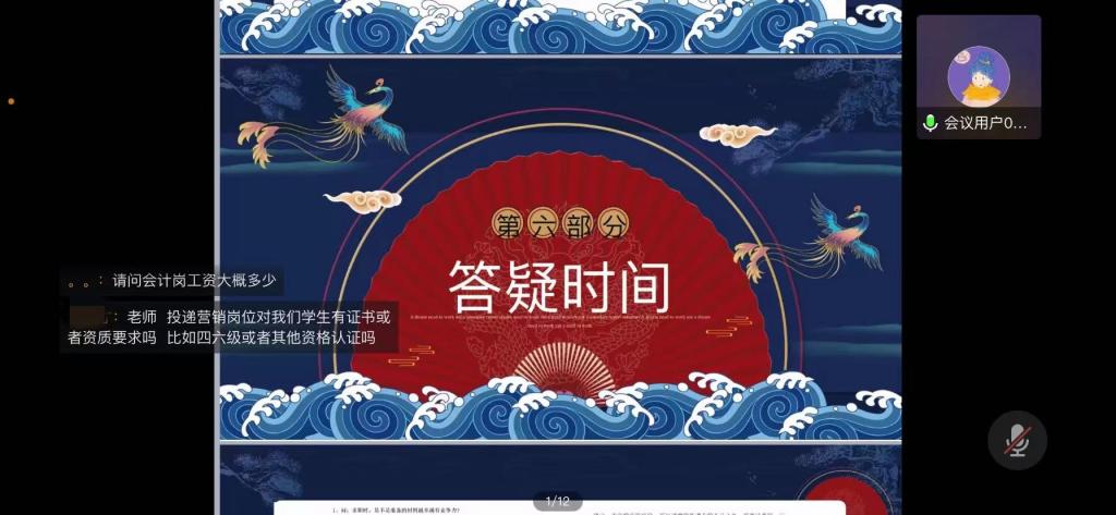 中海化工集团人力资源部的招聘专员通过ppt演讲的形式向毕业生们介绍了集团的基本情况、发展历程、业务范围、团队情况、发展平台、岗位需求等信息。随后,企业针对毕业生们感兴趣的问题进行了线上的答疑。
