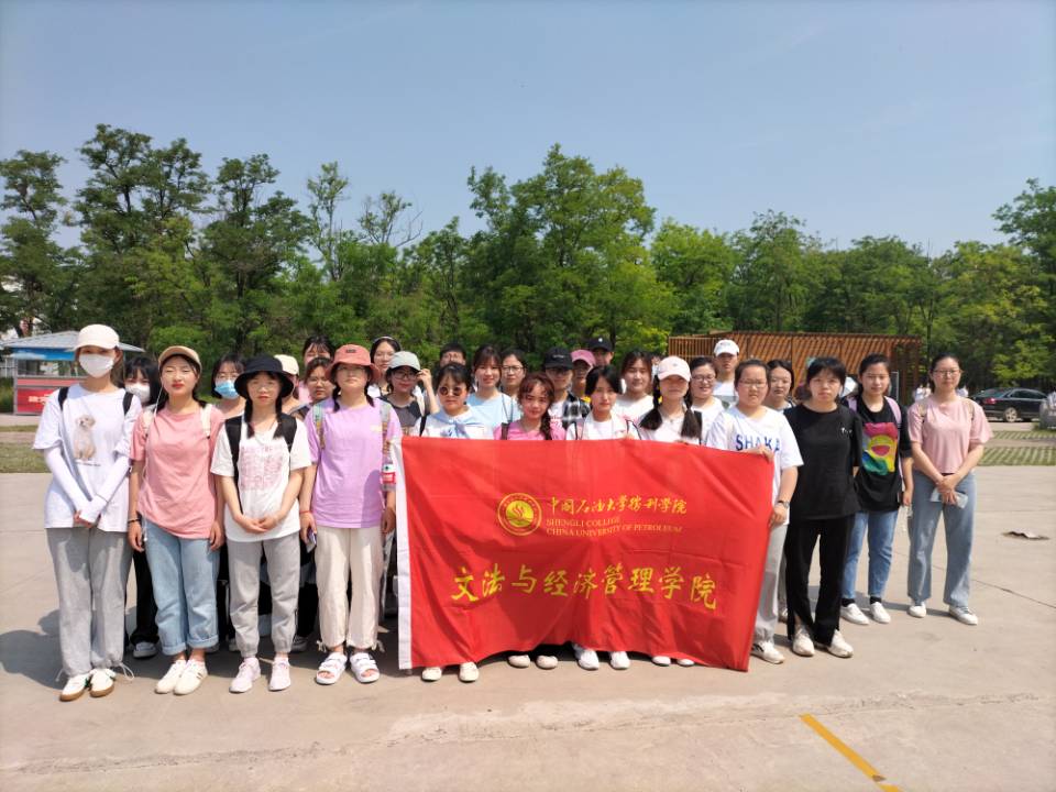 进入孤东海堤,首先映入眼帘的是一排灰白的防波堤,防波堤后靛蓝的海面与雾蓝的天空相连,水天共面的画面深深陶醉了每一位同学。携夹水汽的海风卷过海岸,消解了大家烈日当头的暑意。同学们在海堤上感受到了大海浩瀚壮阔的自然之美,长堤和防波堤完美与海洋融合的人工之美,更有石油工人自强不息、顽强拼搏的石油精神之美。