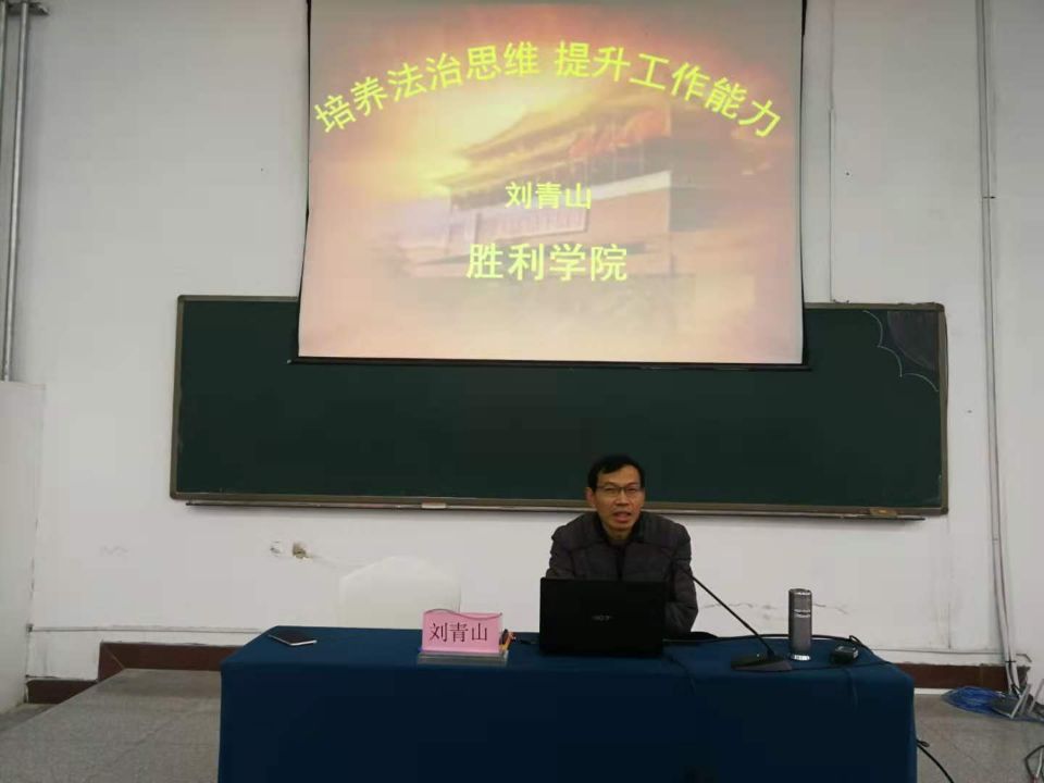 12月2日上午,我院教师刘青山应东营市委组织部邀清,为部分东营市乡村街道干部做普法宣讲,讲座在山东蓝海职业学校举行。