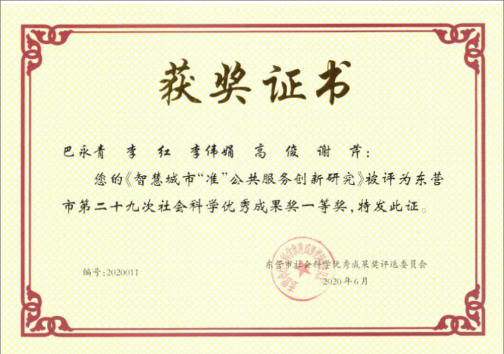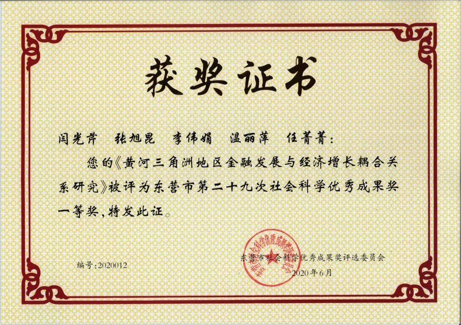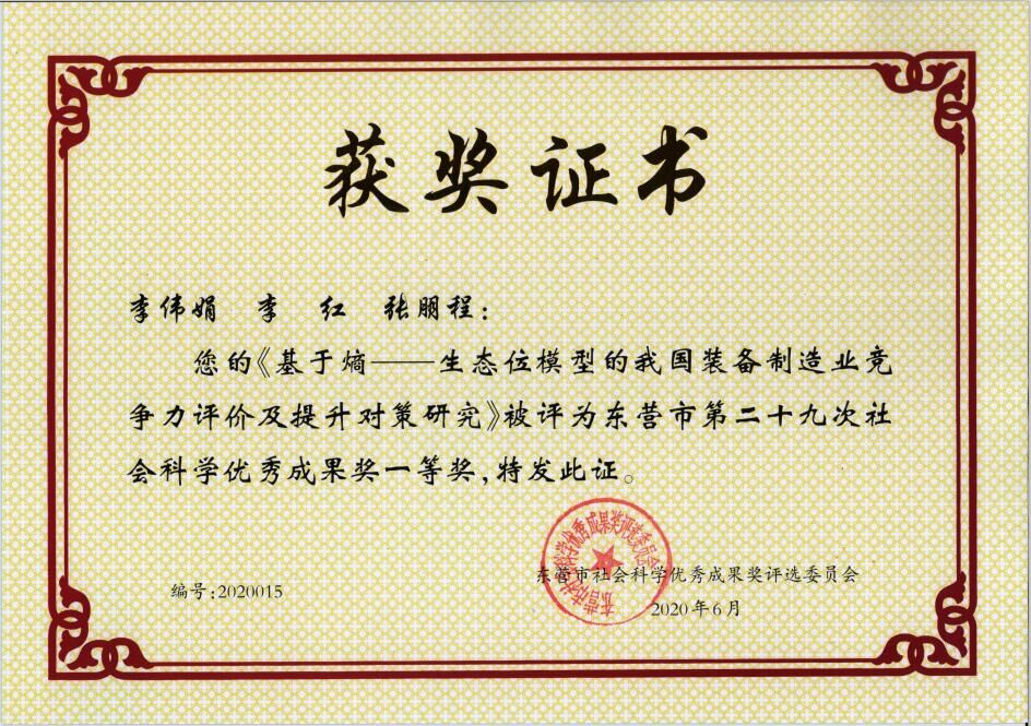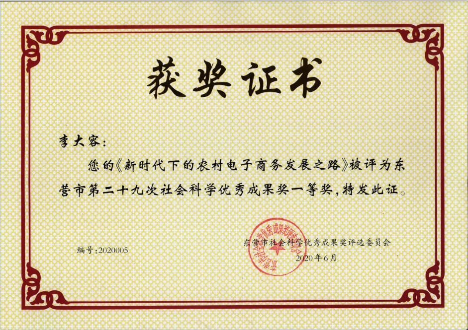 其中,李大容老师的《新时代下的农村电子商务发展之路》成果获著作类一等奖,闫光芹老师的《黄河三角洲地区金融发展与经济增长耦合关系研究》、巴永青老师的《智慧城市“准”公共服务创新研究》课题获课题类一等奖,李伟娟老师的《基于熵——生态位模型的我国装备制造业竞争力评价及提升对策研究》论文获文章类一等奖。