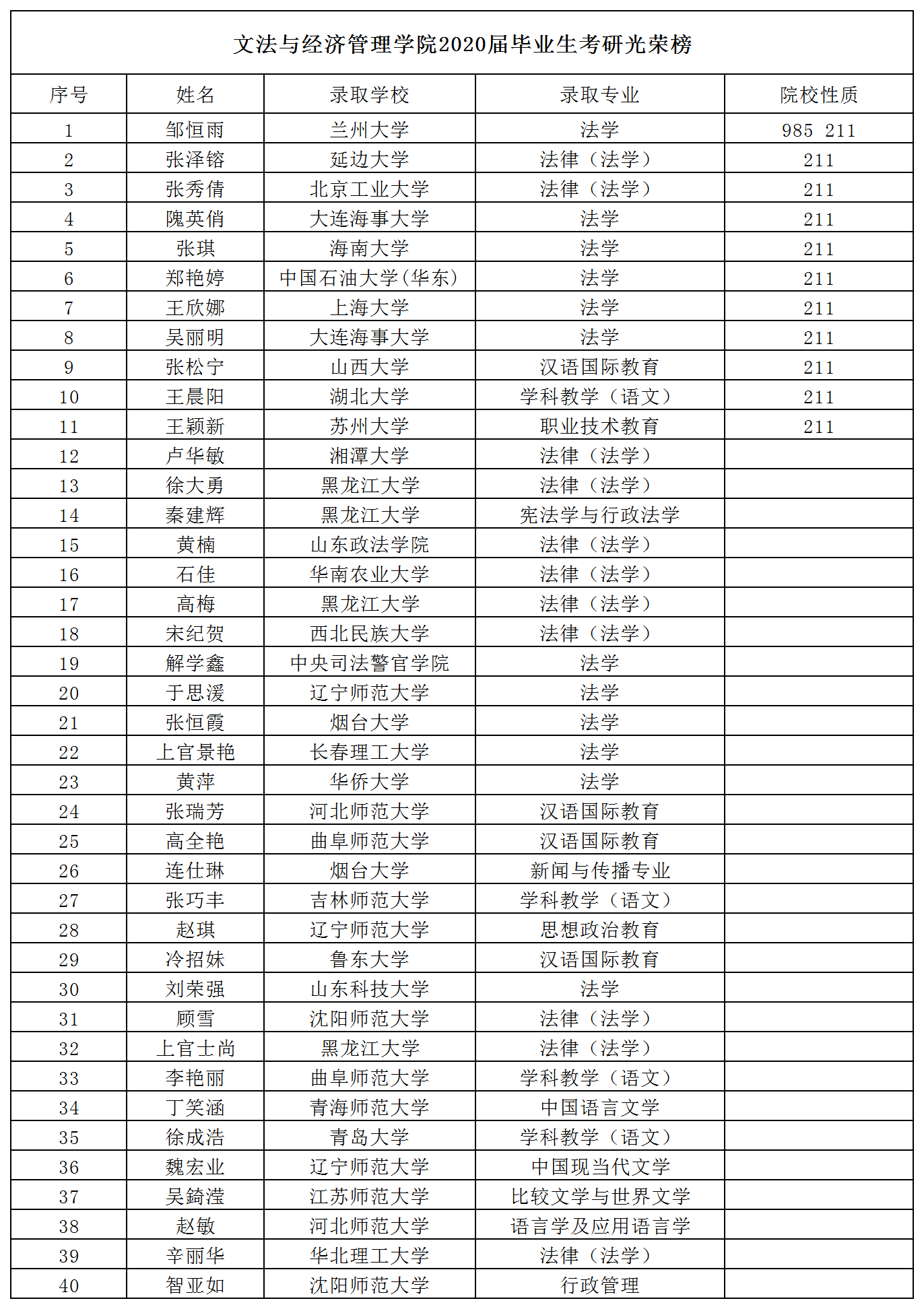 栀子花开季,金榜题名时。随着全国硕士研究生考试录取工作的完成,我院考研喜报频传。据统计,我院今年各专业共474名本科毕业生,209人报名参加研究生考试,40人被国内各大高校录取。其中11人被985、211高校录取。学院2020年度考研录取率为19.13%。