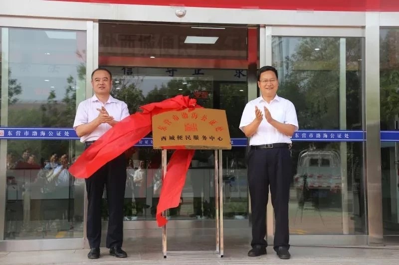 仪式上,崔文书副局长首先致辞,孟昭亮副书记与崔文书副局长共同为东营市渤海公证处西城便民服务中心揭牌。仪式结束后,与会人员参观了东营市渤海公证处西城便民服务中心办事大厅和部分办公场所,观看了东营市渤海公证处发展历程专题片。