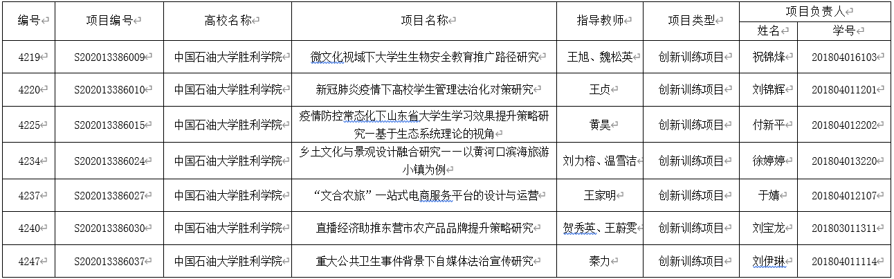 山东省教育厅组织开展了省级大学生创新创业训练计划项目申报和遴选工作经学校推荐、专家评审、教育厅审核、社会公示等程序,2020年立项支持省级大学生创新创业训练计划项目4249项,其中创新训练项目3555项、创业训练项目545项、创业实践项目149项。中国石油大学胜利学院共获批39项。