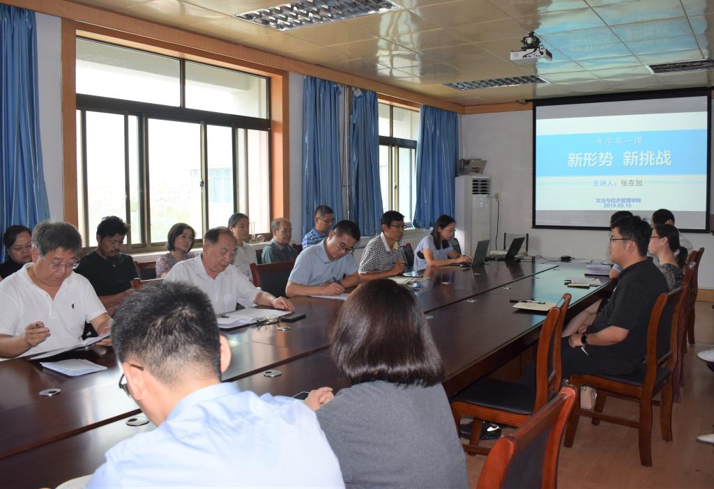 9月10日下午,我院在师专校区办公楼411会议室召开新学期工作会议暨组织“开学第一课”。我院院长张在旭、执行院长薛德枢、党总支书记周向军、副院长刘力榕和刘青山及全院教职工参加了会议。会议由执行院长薛德枢主持。