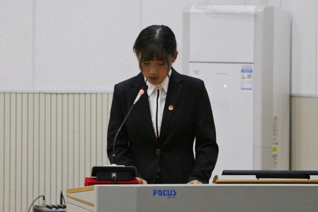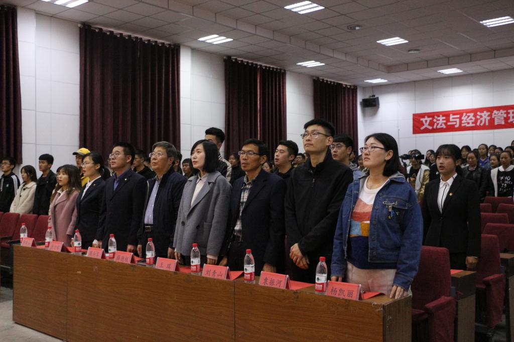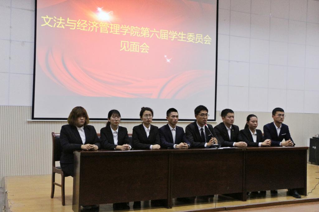 首先,全体起立奏国歌,会议在庄严肃穆的气氛中拉开帷幕。苏晓璐老师介绍与会领导、老师。文法与经济管理学院第五届学生委员会主席郭恩铄同学汇报工作总结,对新任学生干部提出工作要求。