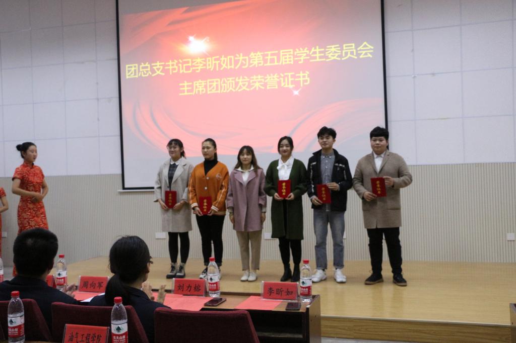 文法与经济管理学院团总支书记李昕如为第五届学生委员会主席团成员颁发荣誉证书。