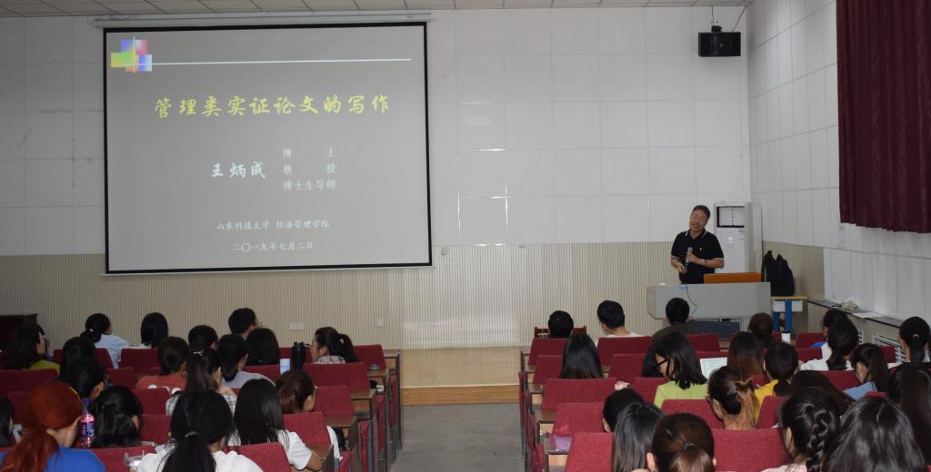7月2日,山东科技大学王炳成教授应邀来我院作了题为“管理类实证论文写作与创新创业教育”的讲座。讲座由我院经济管理系主任李大容主持,我院副院长刘力榕及部分教师,2017级、2018级经管系学生一同聆听了讲座。