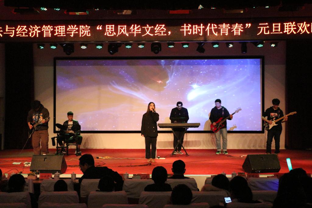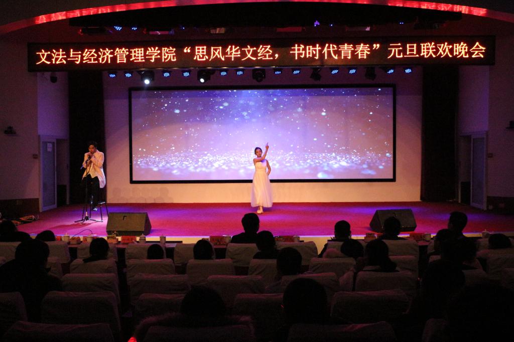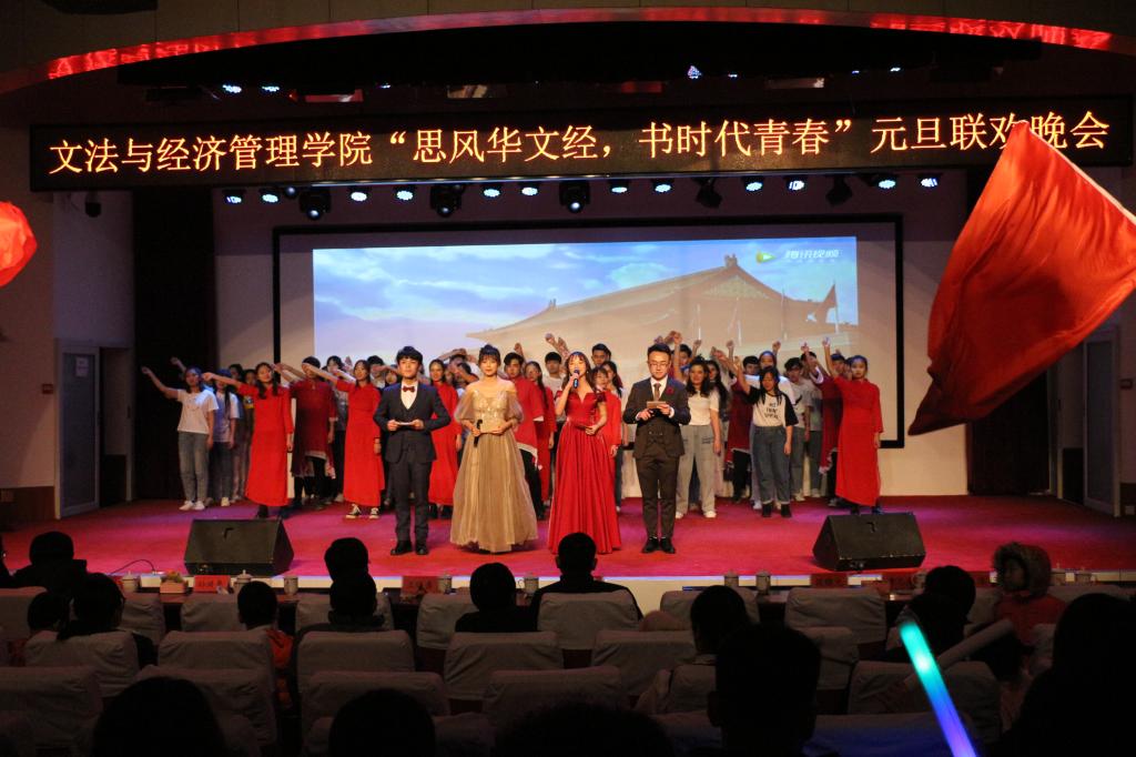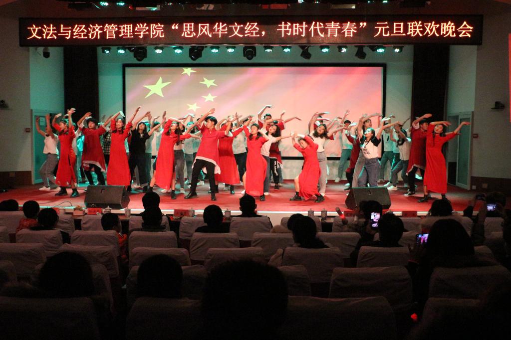 至此,元旦晚会文艺表演正式开始。校学生会爵士舞《pop star》用精彩的舞姿展现了大学生的青春活力,舞动人生之春、舞动青春之华;阿卡贝拉《平凡之路》,让人回忆起坎坷与艰辛、不甘与倔强,也让人相信跨过山河大海,终会看到曙光;相声《博大精深》幽默诙谐,尽展说学逗唱;柔美的音乐伴随飞扬的舞步,歌伴舞《白月光》给人视觉上的盛宴;学长学姐的祝福视频表达了对同学们深深的祝福;乐队演唱带来激情与动感的碰撞;翩若惊鸿,婉若游龙,唯美的古典舞《惊鸿如你》重现百年曼妙画卷;独唱《来自天堂的魔鬼》唱出了回忆的无限美好;舞蹈《bangbangbang》的动感节奏燃爆全场;歌曲串烧《青春点唱机》翻开那本关于青春的回忆纪念册;朗诵《青春报告》用铿锵的言语展现青年人的奋发向上,时刻准备着向祖国报告;全场大合唱《强国一代有我在》唱出学生们的责任与担当,唱出新一代青年为强国梦添砖加瓦、锦上添花的决心;舞蹈《我和我的祖国》饱含着同学们对祖国的热爱、对未来的无限期望,绽放着青春与梦想的光芒,为晚会画上了一个圆满的句号。