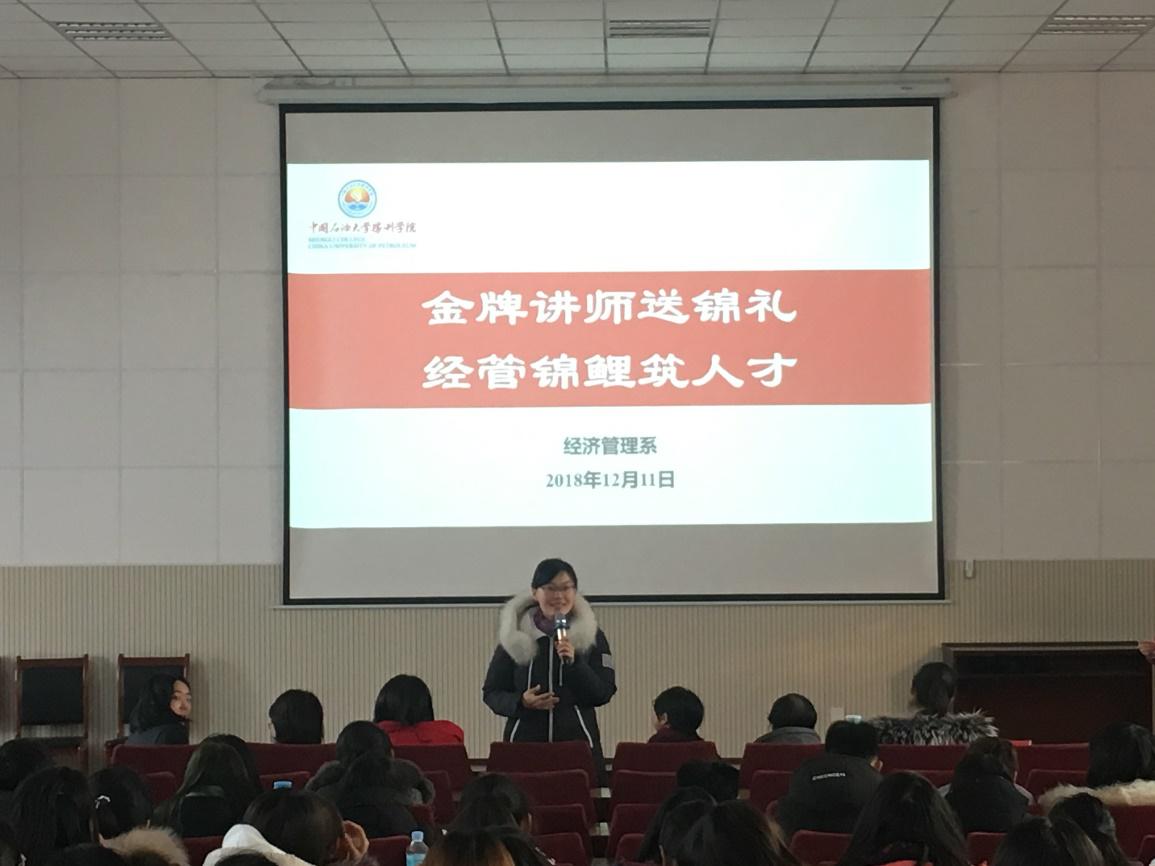 为进一步提升学生培养质量,我院经济管理系特组建金牌讲师团于12月11日下午在师专校区南电教为大一新生举办“金牌讲师送锦礼经管锦鲤筑人才”的“锦鲤计划”活动。我院副院长刘力榕、经济管理系主任李大容、财务管理教研室主任路玲、市场营销教研室主任王家明、经济管理系兼职秘书任菁菁、金牌讲师高倩、王蔚雯、姜姿羽及部分经管系教师出席了本次活动,2018级市场营销专业和财务管理专业学生全员参加。活动由王家明老师主持。