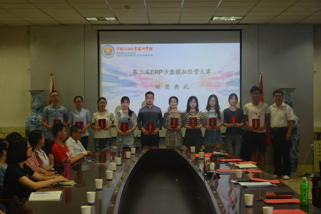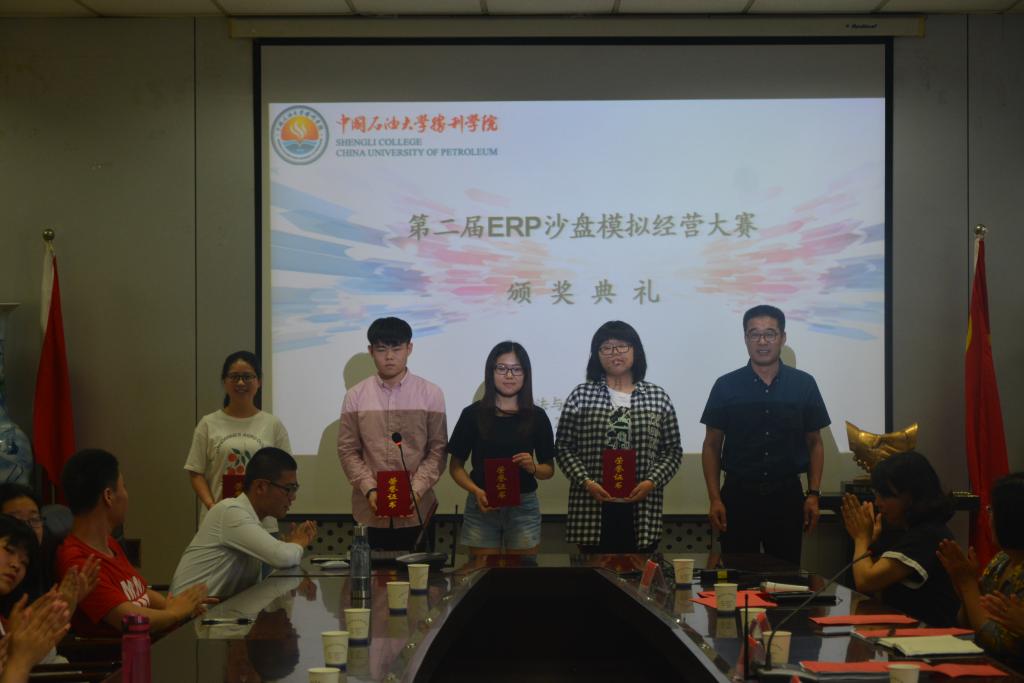 本次颁奖典礼由经管系系主任李大容主持。首先,李大容主任对第二届ERP沙盘模拟经营大赛的组织、实施等情况做了简要介绍,指出此次比赛参赛人员之多、参赛专业范围之广创新高。紧接着,参赛学生代表邹韵同学以PPT形式分享了参加本次ERP比赛及集训的体验收获。随后,李大容主任现场公布获奖队伍名单,薛德枢院长、周向军书记、刘力榕副院长分别为获奖队伍颁奖,并合影留念。