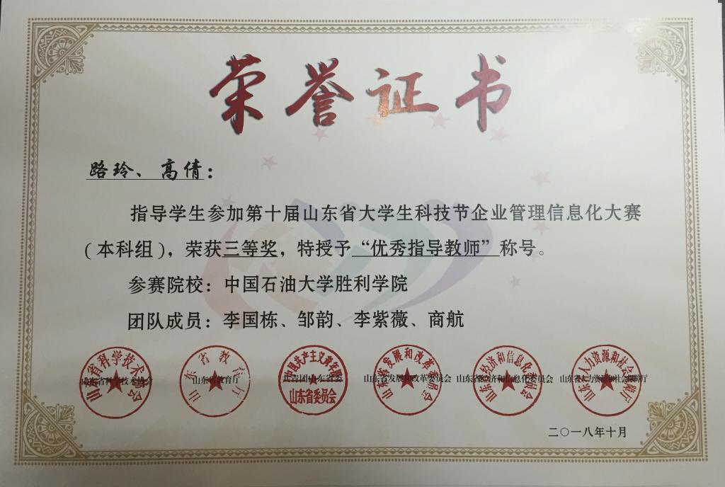 10月21日,由山东省科协、省教育厅、团省委、省发改委、省经信委、省人社厅联合主办的第十届山东省大学生科技节企业管理信息化竞赛(本科组)在山东财经大学举行。我院经管系2017级财务管理专业的李国栋、李紫薇、商航、邹韵四位同学荣获团体三等奖,路玲、高倩两位老师荣获“优秀指导教师”。