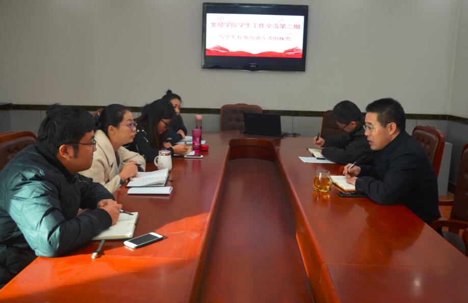 12月8日上午,我院在师专校区办公楼三楼会议室召开“文经学院学生工作交流第二期——与学生有效沟通方式的探究”专题交流会。我院党总支书记周向军,学工办主任仝世涛及我院全体辅导员参加了此次会议。