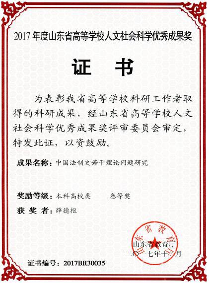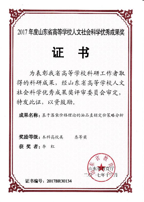近日,山东省教育厅公布了2017年度山东省高等学校人文社会科学优秀成果奖评审结果,我院3名教师喜获三等奖,分别是薛德枢院长的《中国法制史若干理论问题研究》、李红老师的《基于落袋价格理论的油品直销定价策略分析》和李伟娟老师的《基于熵-生态位理论的黄河三角洲文化创意产业竞争力评价》。这是我院教师自2014年以来首次获得这一奖励。