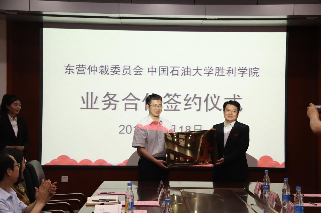 5月18日下午,我校与东营仲裁委员会在主校区501会议室签订院委业务合作协议。东营仲裁办党组书记、主任薛在山、东营仲裁办党组成员、副主任张俊国、东营仲裁办调研员王建明,我校副院长赫正、教学科研处处长杨树林、副处长王贞及文法与经济管理学院有关领导参加仪式。仪式由文法与经济管理学院执行院长薛德枢主持。
