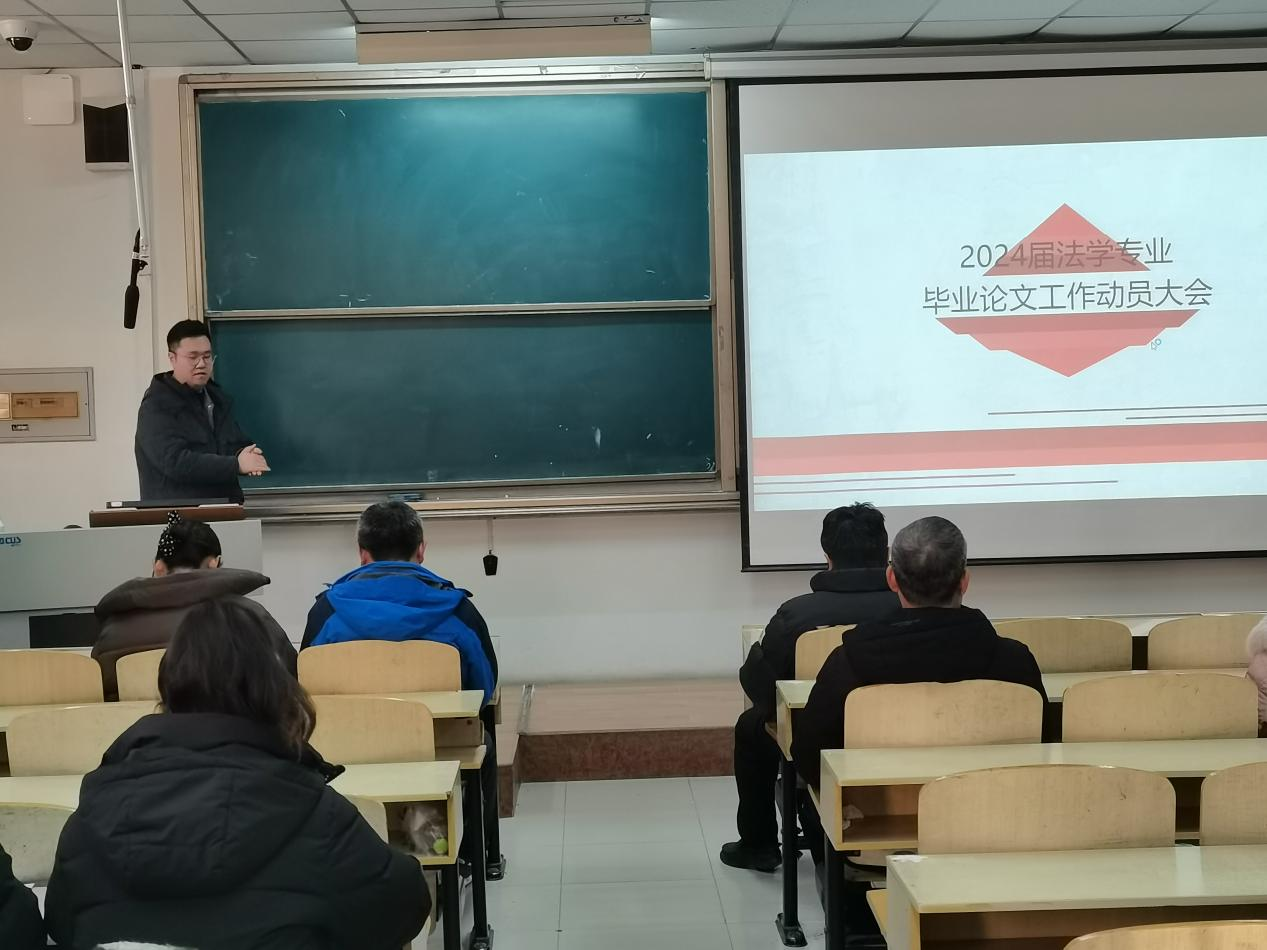 12月25日下午,我院法学系在四教205教室召开2024届毕业生毕业论文动员大会。我院党总支副书记、副院长薛德枢,法学系主任王博,教学科研办公室主任石晓旭、教研室主任仝世涛、樊颖,专业各指导老师及2024届全体毕业生参加了此次会议。