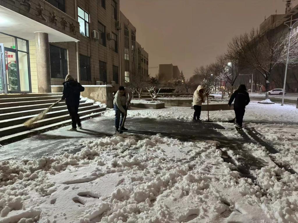 12月14日,我市出现寒潮、雨雪和大风天气,降雪同时伴有大风雪阻现象,能见度低。积雪覆盖了整个校园,给校园道路交通,学生上课带来诸多不便。12月14日晚到15日中午,我院教师以及学生志愿者高质量、高标准、高效率完成分担区域清雪工作。