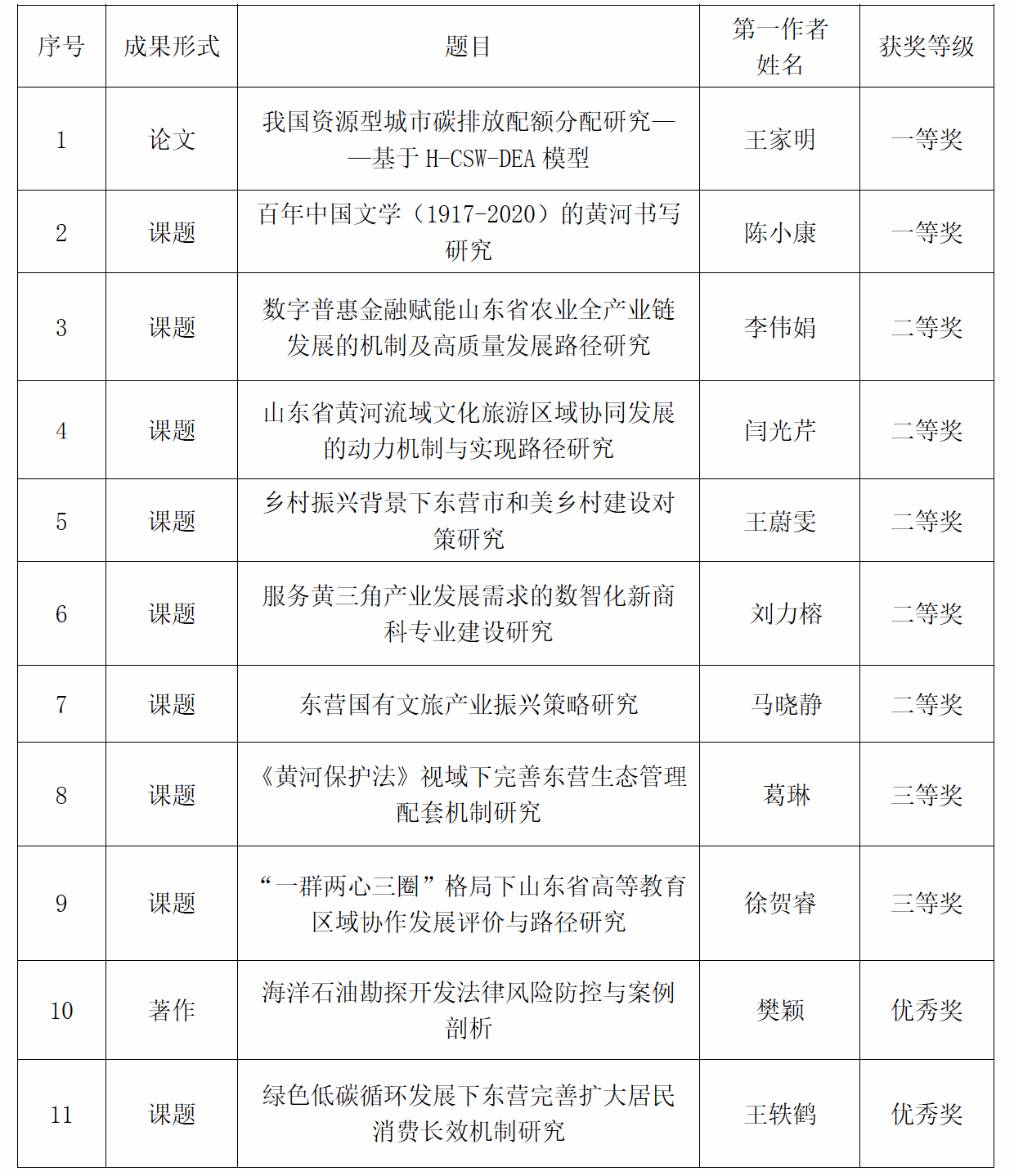 近日,东营市社会科学优秀成果奖评选委员会发布了《东营市第三十四次社会科学优秀成果奖评选情况公示》,本次共评选出一等奖20项、二等奖40项、三等奖80项、优秀奖60项。全校共19项获奖,我院11项成果获奖,其中一等奖2项,二等奖5项,三等奖2项,优秀奖2项。