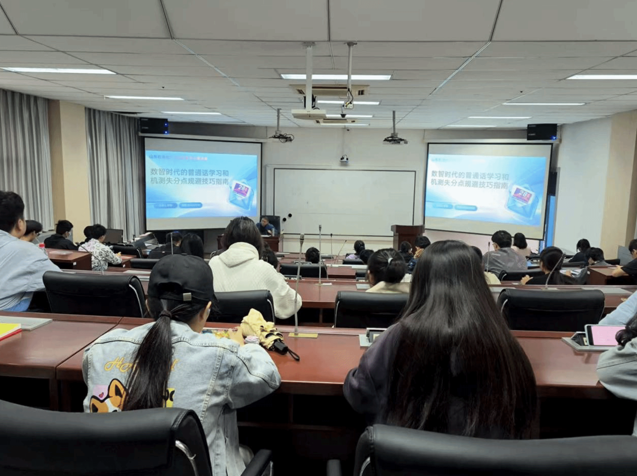 苏健老师以“数智时代的普通话学习和机测失分点规避技巧”为题,从“推普周时代意义”“国家-社会-个人视角下的语言价值”“推普学习小妙招与机测失分点规避”“语言强国展望”四大板块展开分享,内容涵盖普通话战略地位、学习方法、机测技巧等,实用性与前瞻性兼具。互动环节中,师生就学习难点、机测细节积极提问,现场交流热烈。