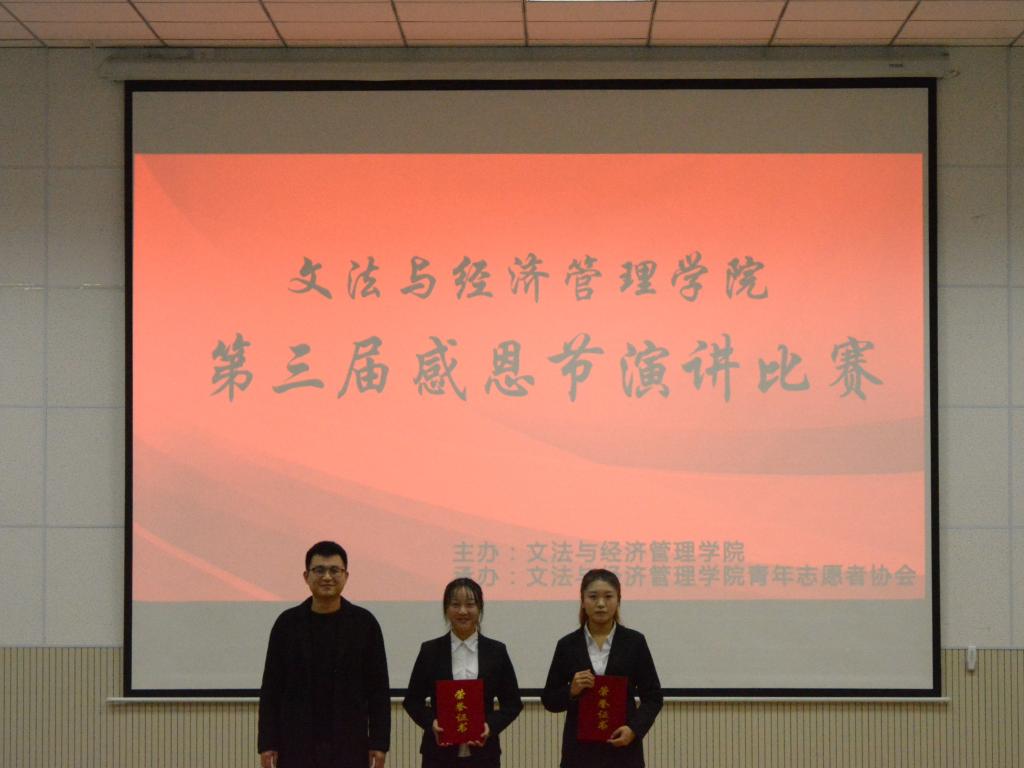 11月22日晚,我院主办、青年志愿者协会承办的“第三届感恩节演讲比赛”在师专校区南电教举行。莅临本场比赛的嘉宾有化学工程学院学工办主任张成明、基础科学学院团总支书记孙志超、我院学工办主任仝世涛、中文系老师侯丽敏以及各专业辅导员老师。王菲、张树真主持本次比赛。