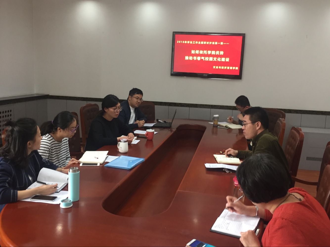 随后,各位辅导员就这一论题,发表了自己的意见和看法,对该问题进行了深入的讨论。辅导员们表示,建设书卷气校园除了可以从软件建设着手以外,也可从硬件建设着手,注重环境熏陶。比如在教学楼大厅、走廊等地张贴宣传报,创建文化墙,让学生潜移默化地接受文化熏陶;设立书吧,实现有藏书之所,有读书之处,推动书卷气校园建设。