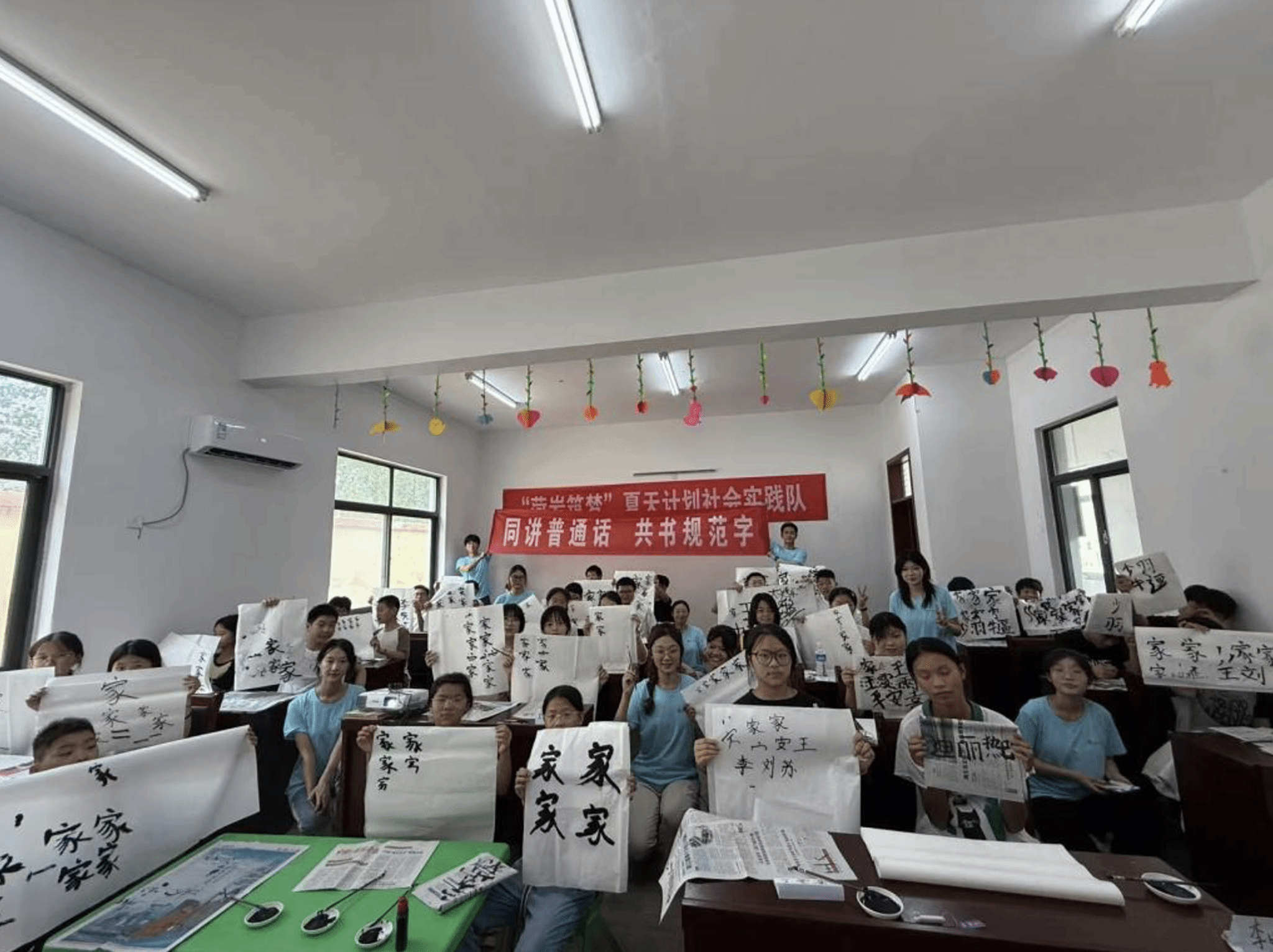 实践团在东明马头镇中学,通过特殊语音讲解、成语朗读等形式提升学生普通话能力,还结合毛笔字教学,以“家” 字为切入点,让学生感受语言与文字之美。